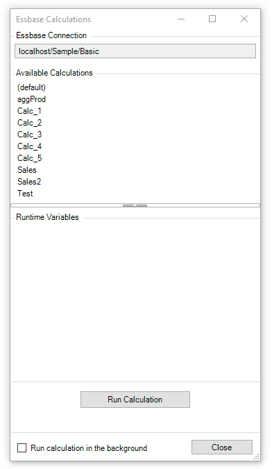 When run on the main thread, the application is suspended or “frozen” until the calculation completes, which prevents any user interaction. When run on a background thread, the user is able to interact with the application, such as performing Excel or Essbase operations, while the calculation is running on the server.